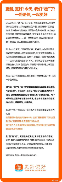 12月5日,淘宝闪购官方微博账号发文:“更新,更好!今天,我们“橙”了!” 值得注意的是,淘宝闪购官方微博账号