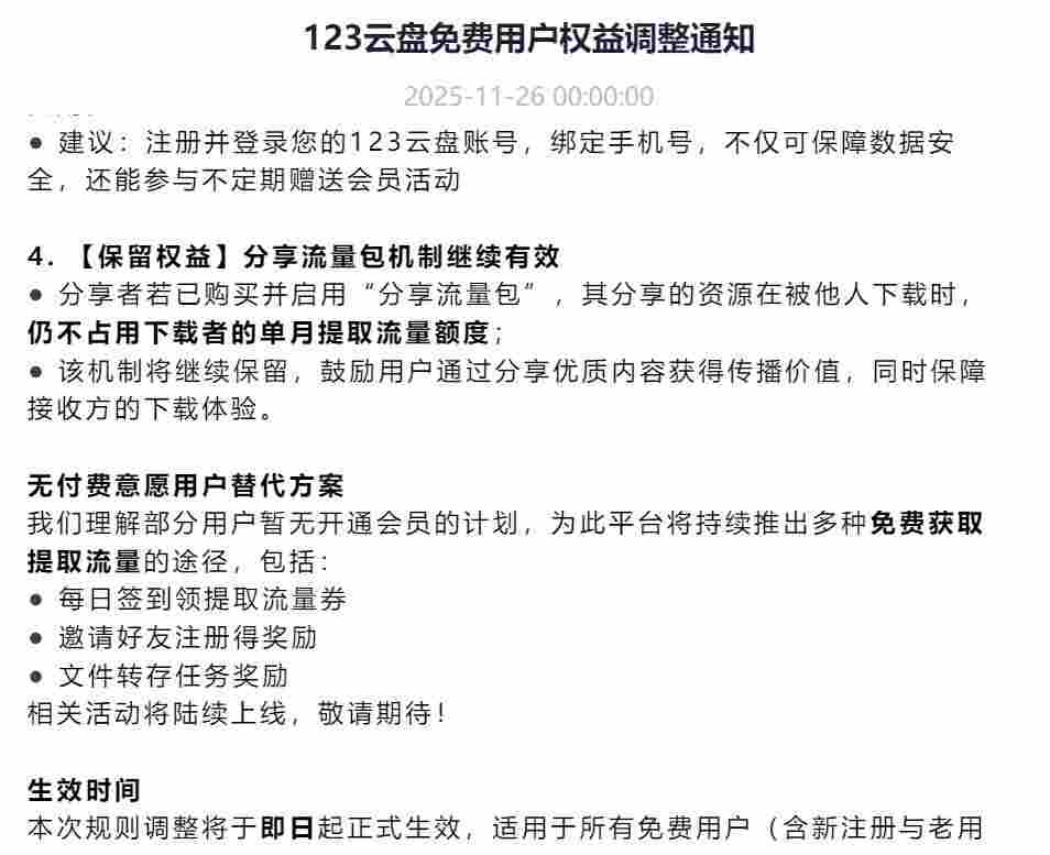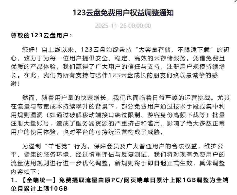 11 月 26 日消息,123 云盘今日发布免费用户权益调整通知,表示随着用户量的快速增长,平台面临着日益严峻的运营挑战。