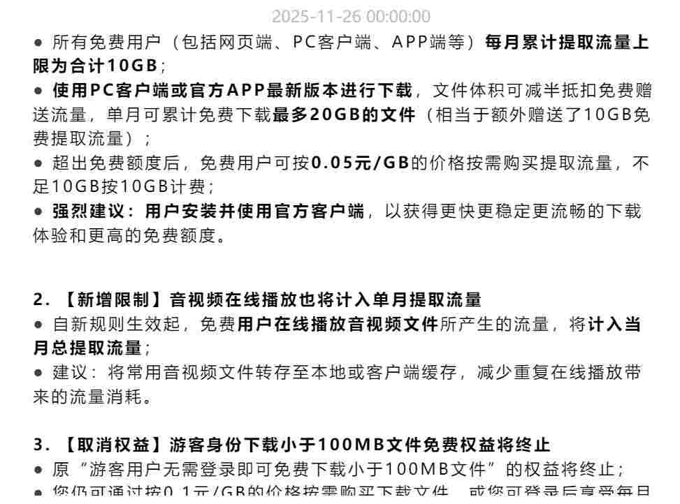 原“游客用户无需登录即可免费下载小于 100MB 文件”的权益将终止;